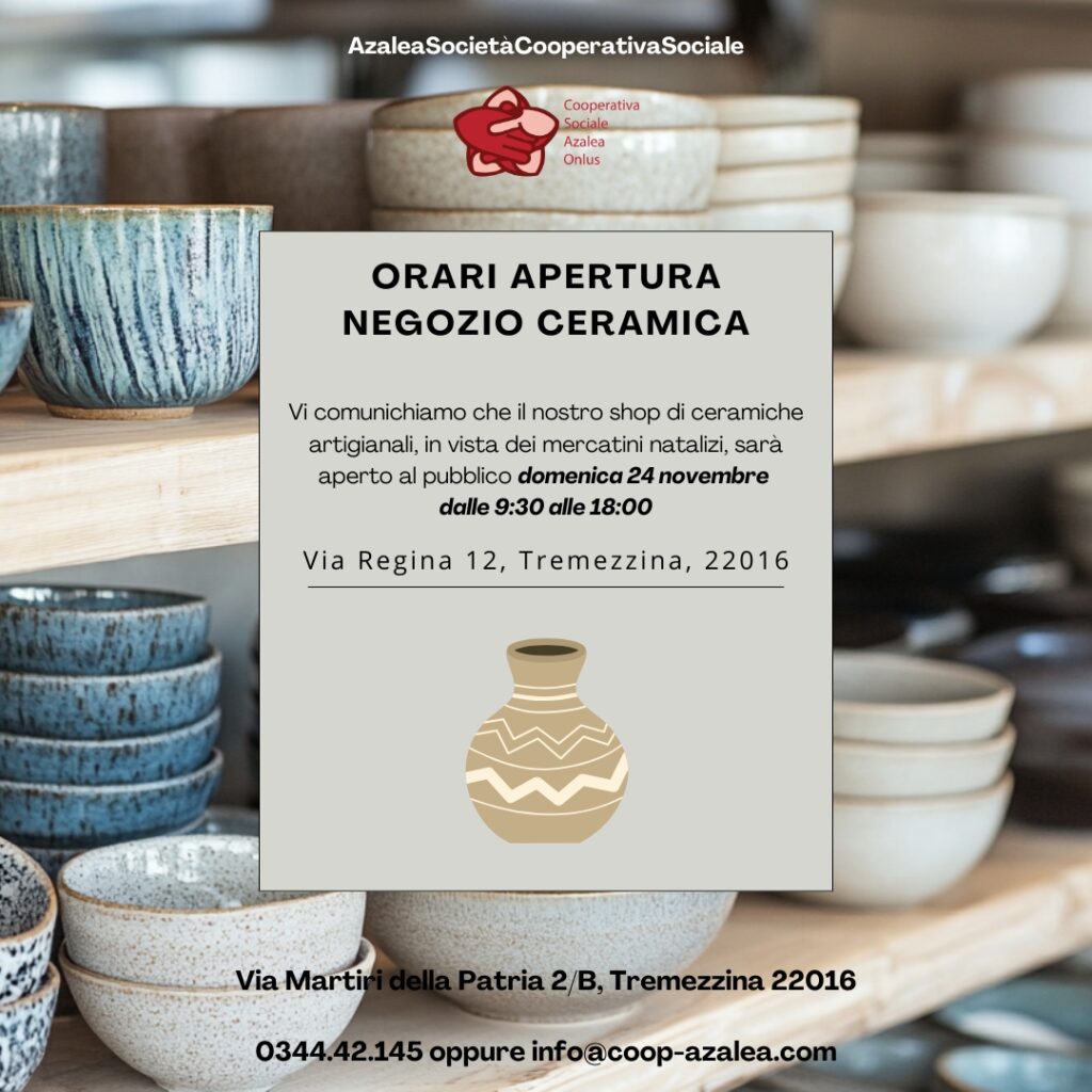 Vi comunichiamo che domenica 24 novembre, il nostro laboratorio di ceramica in Via Regina 12 a Tremezzo, rimarrà aperto dalle 9:30 alle 18:00 in occasione dei mercatini natalizi; troverete tanti articoli artigianali per un regalo solidale.