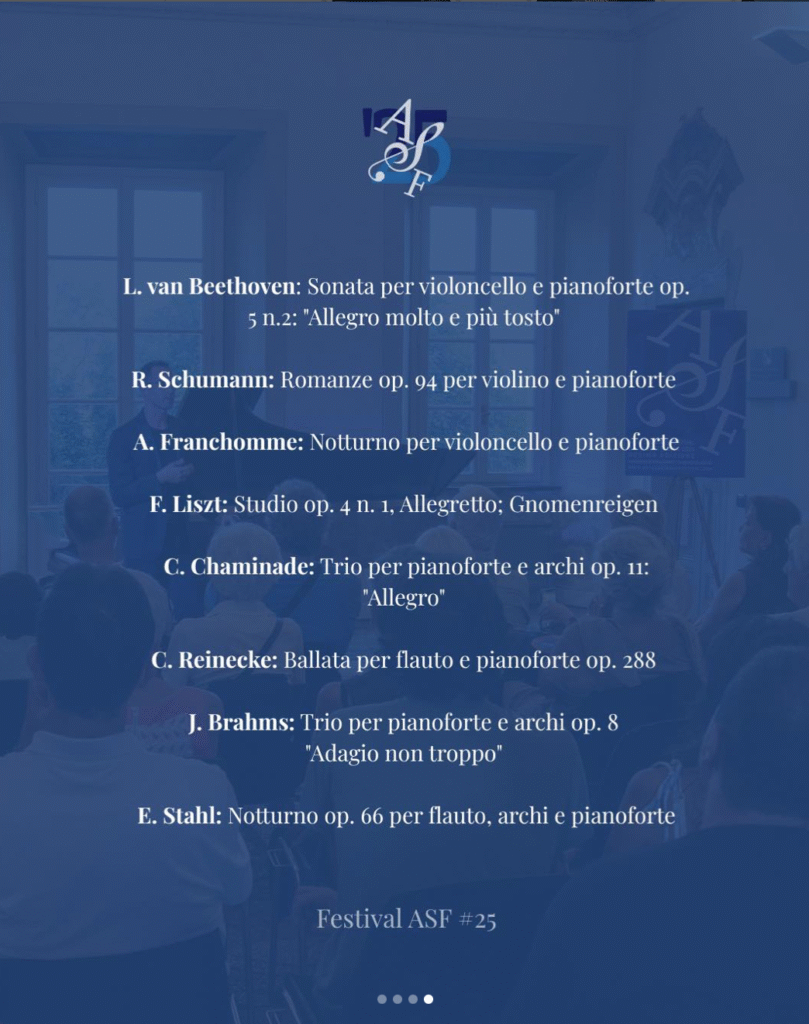 I concerti si svolgono a fine estate nelle principali ville e residenze storiche della zona, un tempo frequentate da compositori come Johannes Brahms e Franz Liszt. Ogni anno, ASF riunisce un gruppo di giovani artisti che, alternandosi in varie formazioni cameristiche, danno vita a un’esperienza artistica ricca e conviviale, tanto per i musicisti quanto per il pubblico, nelle splendide location del Lago di Como.