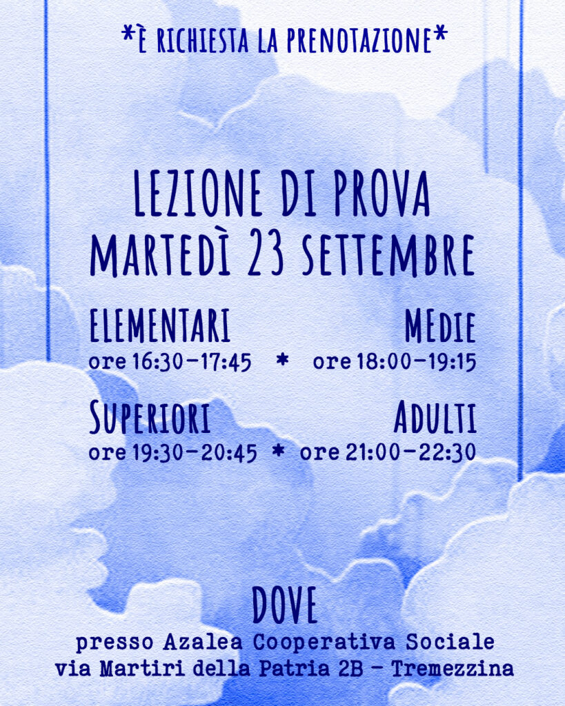 Lezione di prova Martedì 23 Settembre, richiesta la prenotazione